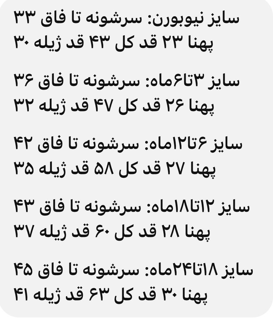 لطفا قبل از ثبت سفارش، سانت را با نرمالترین لباس فرزند خود چک کنید و یک الی دوسانت خطا در اندازه گیری قرار دهید.