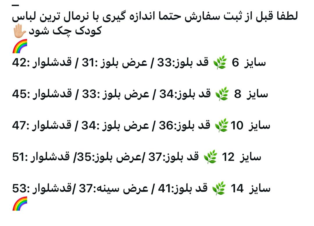 لطفا قبل از ثبت سفارش، سایز را با نرمالترین لباس فرزند خود چک کنید و یک الی دوسانت خطا در اندازه گیری قرار دهید.