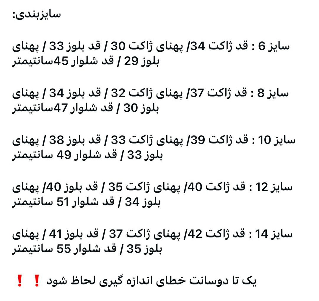 لطفا قبل از ثبت سفارش، سایز را با نرمالترین لباس فرزند خود چک کنید و یک الی دوسانت خطا در اندازه گیری قرار دهید.