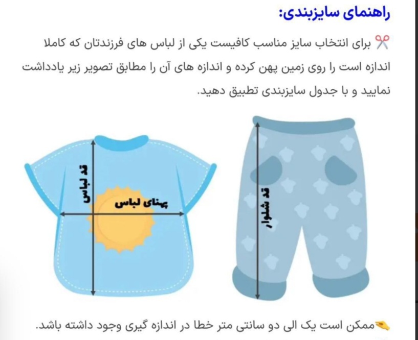 لطفا قبل از ثبت سفارش، سایز را با نرمالترین لباس فرزند خود چک کنید و یک الی دوسانت خطا در اندازه گیری قرار دهید.(راهنمای سایزبندی اسلاید آخر عکسها)