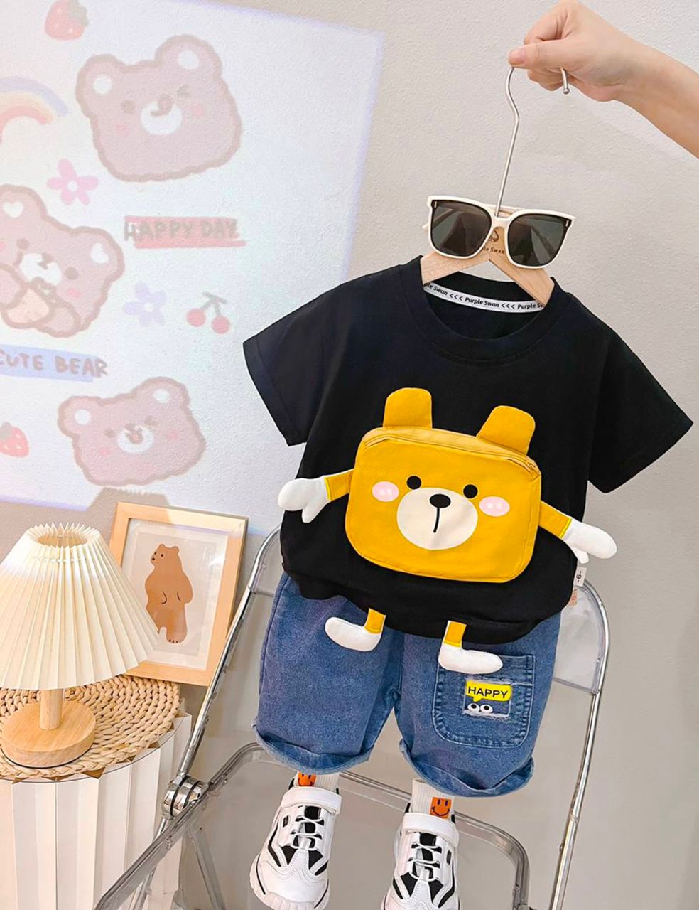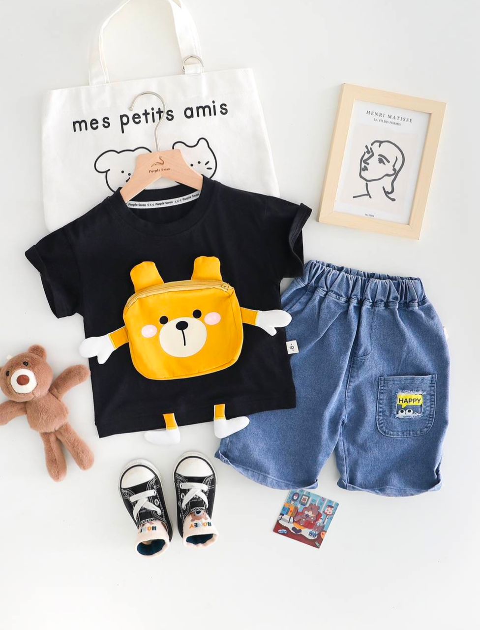 وارداتی و اورجینال جنس تیشرت نخ پنبه با عروسک زیپ دار عـالی جنس شلوارک جین اصل سایز نه ماهـ🌙 تا پنج سال