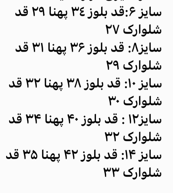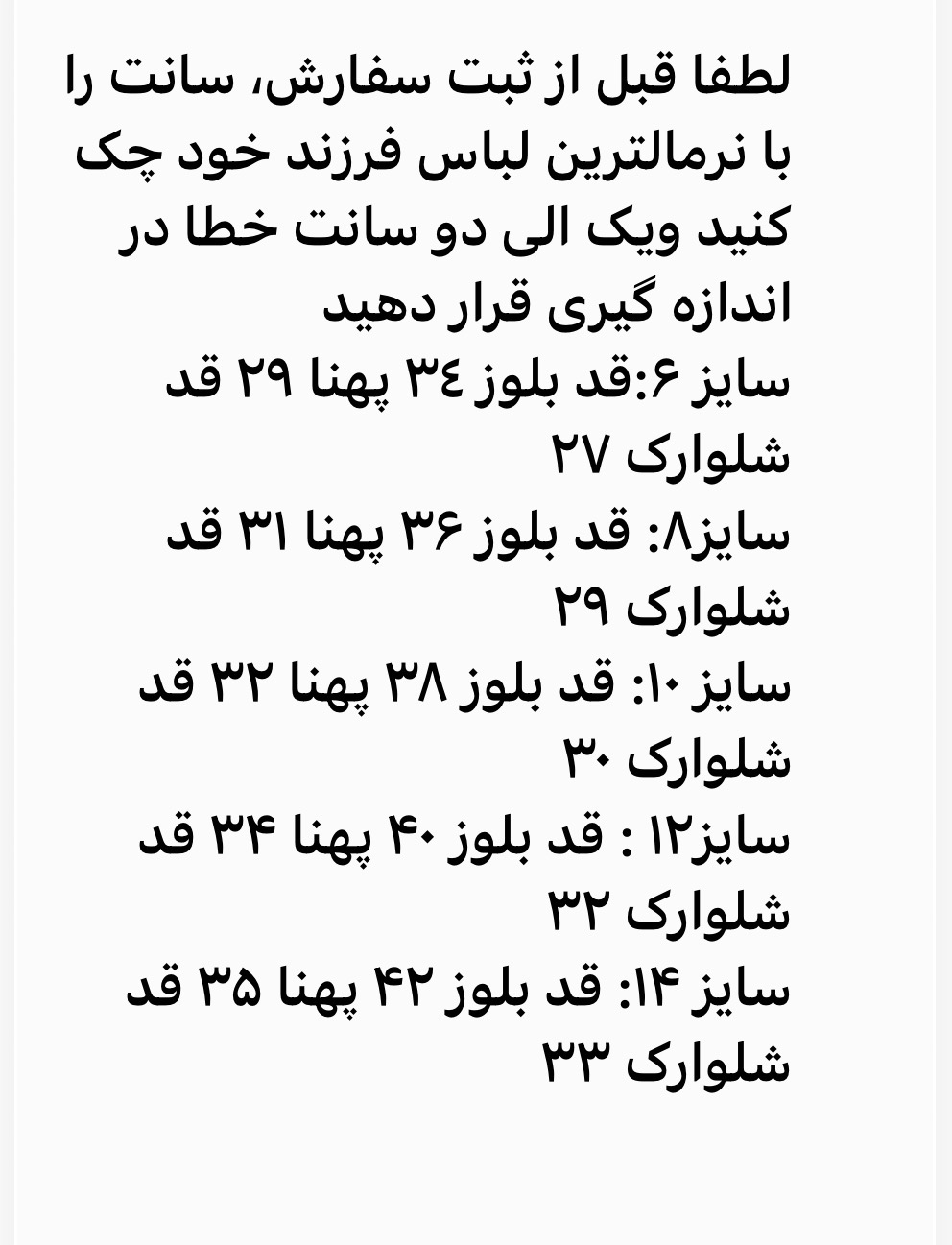 لطفا قبل از ثبت سفارش، سایز را با نرمالترین لباس فرزند خود چک کنید و یک الی دوسانت خطا در اندازه گیری قرار دهید