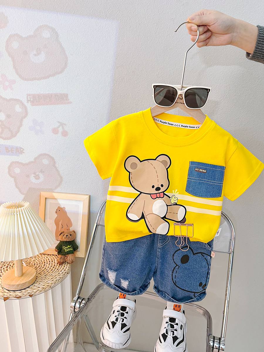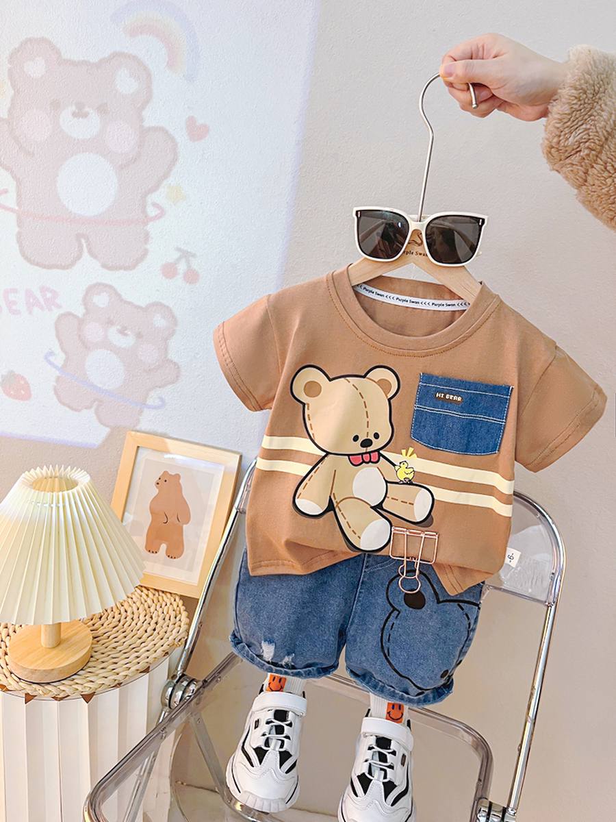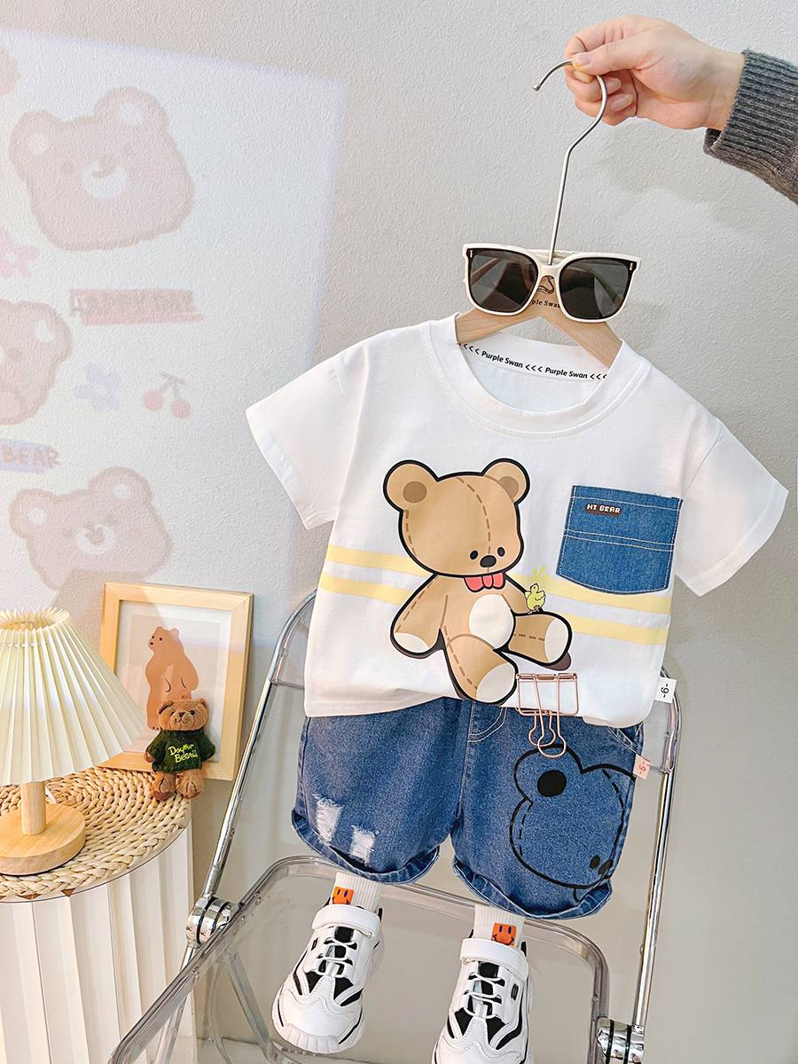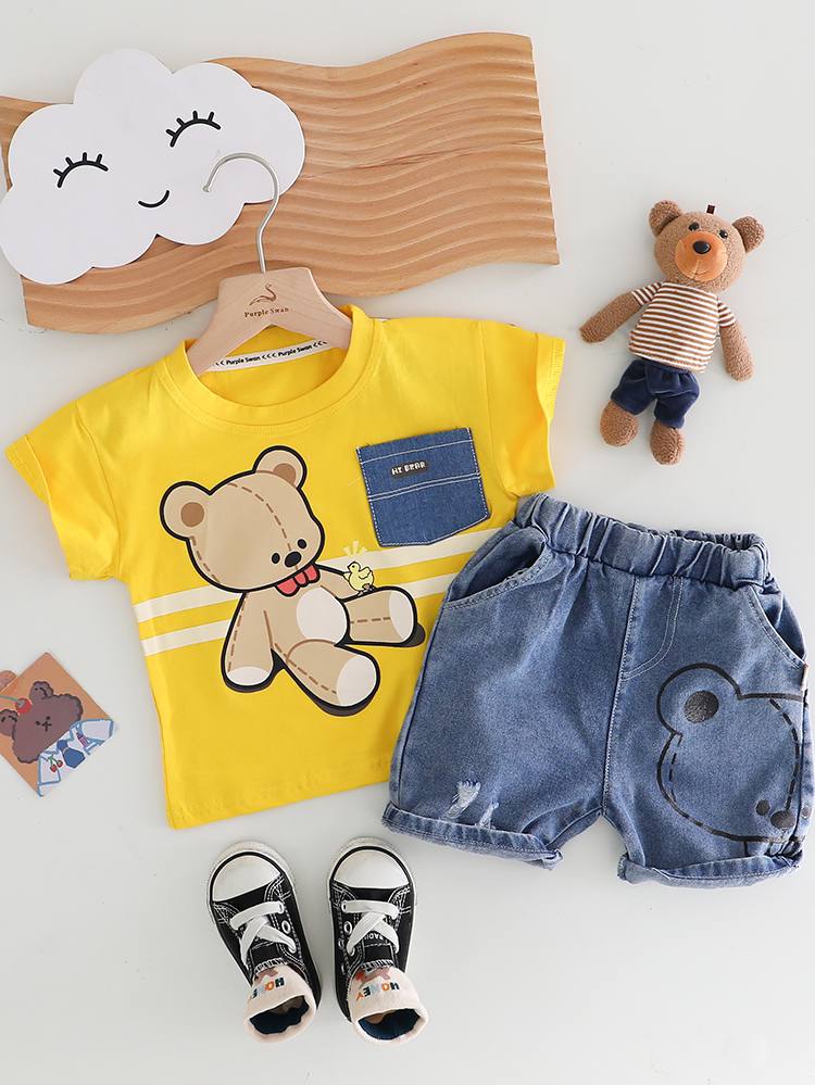 جنس تيشرت نخ پنبه بسيار نرم و سبك درجه يك جنس شلوارك جين صددرصد اورجينال سايز بندى : ٩ ماه تا پنج سال يك الی دو سانت خطاى اندازه كَيرى در نظر بكَيريد #لطفا در انتخاب سايز دقت كنيد