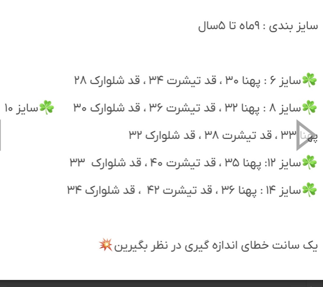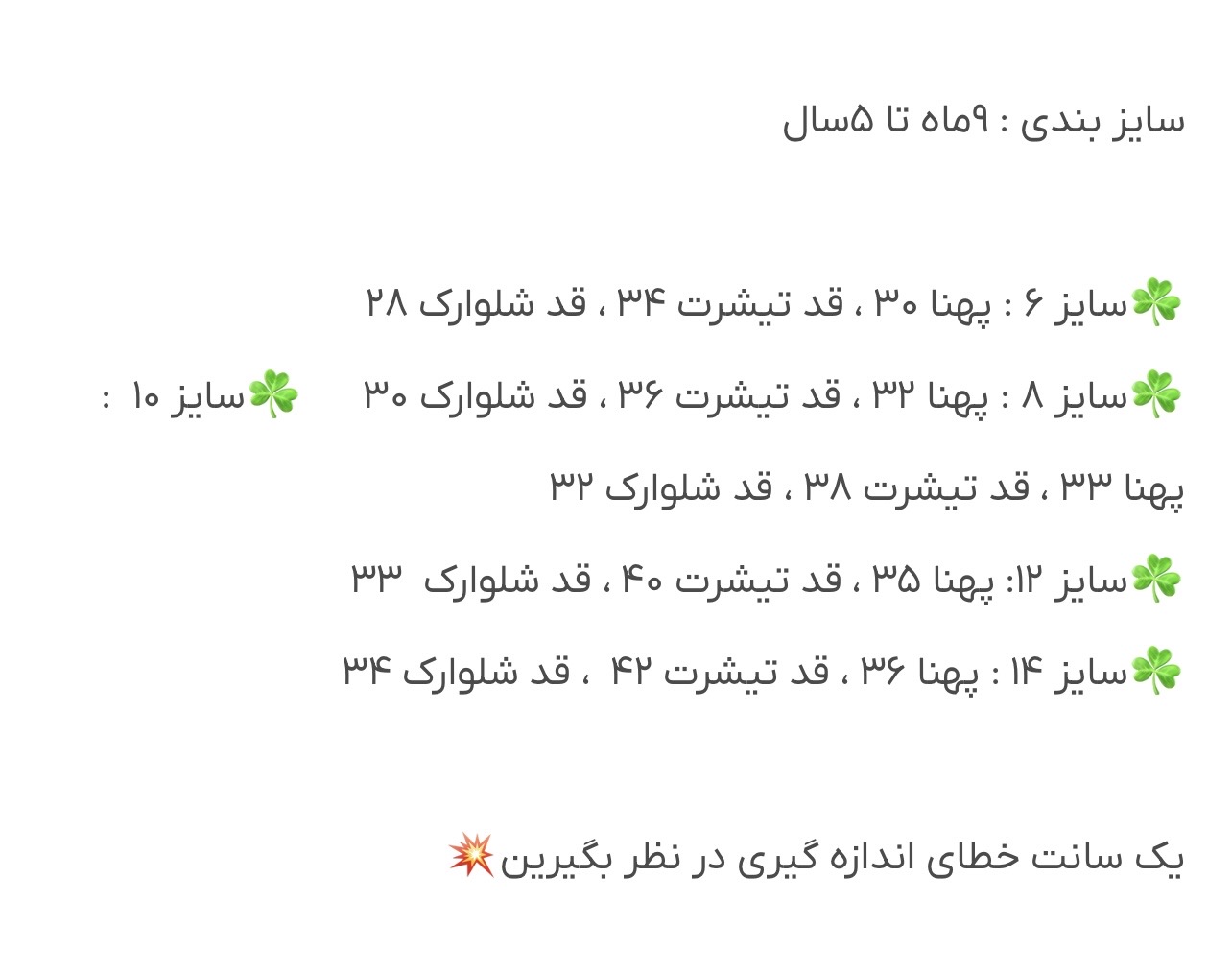 لطفا قبل از ثبت سفارش، سایز را با نرمالترین لباس فرزند خود چک کنید و یک الی دوسانت خطا در اندازه گیری قرار دهید